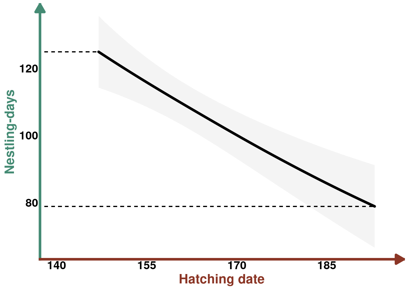 geom_segment(y=max(pred_temp$estimate), x = 0, xend= max(pred_temp$timing_clutch), linetype= "dashed") +