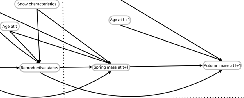 )Crémel et al. plot all of the direct effects in the DAG so we will not be repeating this here. We will only focus on the interacting effect of snow variables with reproductive status on spring mass and the interacting effect of spring mass and reproductive status on autumn mass. For the demonstration, we will work only with Average snow depth as the Snow variable. See Crémel et al. for all indirect effects.